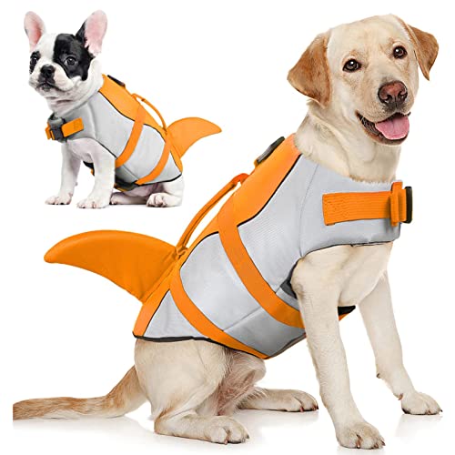 AOFITEE Dog Life Jacket Pet Safety Vest, Adjustable Dog Lifesaver Ripstop Pet Life Preserver with Rescue Handle for Small Medium and Large Dogs (Orange Shark, XS)