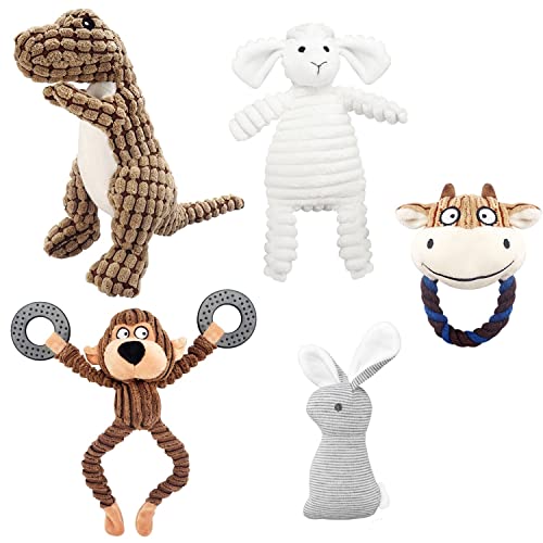 KONKY Squeaky Dog Toy Set, 5 Packs Durable Dog Plush Toys Chew Toys Dog Companion, Various Animals Shapes Training Toy for Puppy Small Medium Large Dogs (Dinosaur, Monkey, Sheep, Rabbit and Bull)