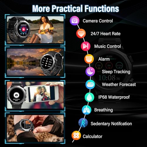Military Smart Watch for Men Women Answer/Make Calls, 112 Sports Modes Fitness Watch with Sleep Monitor/Step Counter/Activity Tracker, IP68 Waterproof Outdoor Smartwatch for Android IOS, Black