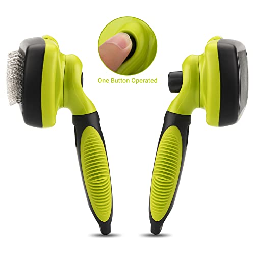 ★ EASY TO CLEAN: The round, green button on the handle operates a very simple and yet ingenious mechanism for releasing all the dead fur and debris that the brush picks up. The retractable bristle design keeps the grooming brush safe and easy to store in your grooming kit when it is not in use.
