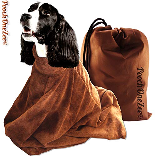 PoochOneZee® Dry Fast Dog Bag – Keep Water, Mud and Dirt Out of Your Home and Car – Super Absorbent Microfibre Zip Up Dog Bag – Thick Hook and Loop Neck Strap – Cozy Brown