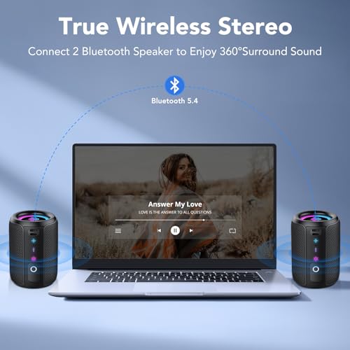 5.4 Bluetooth technology & Wide Compatibility: Equipped with Bluetooth 5.4, this wireless Bluetooth speaker delivers faster pairing, lower latency, and 10-meter stable range. It seamlessly connects to phones, tablets, TVs, notebook computers and more, supporting multiple devices simultaneously—perfect for switching between music and calls. This wireless speakers with bluetooth is equipped with true wireless stereo technology which provides independent left and right channels, allowing you to really enjoy the cinema-like surround sound, and the built-in microphone can realize hands-free calls, so that you can enjoy both work and entertainment.