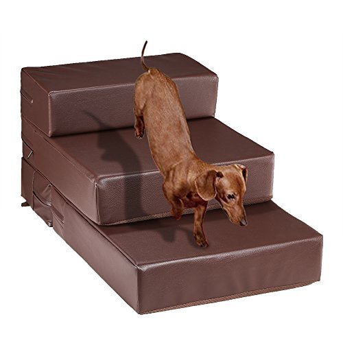 Portable Pet Stairs 2 Or 3 Steps For Dog Cat PU Leather Covered Padded Base Non Slip – Brown