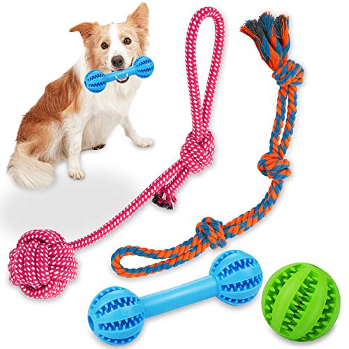 Wimypet Dog Toys Puppy Chew Toy Dog Ball Durable Teething Interactive Training Cleaning with Rubber Treat Ball Chew Bone Natural Cotton Rope Knot Dog Toys For Gift Small and Medium Large Dogs-4PCS