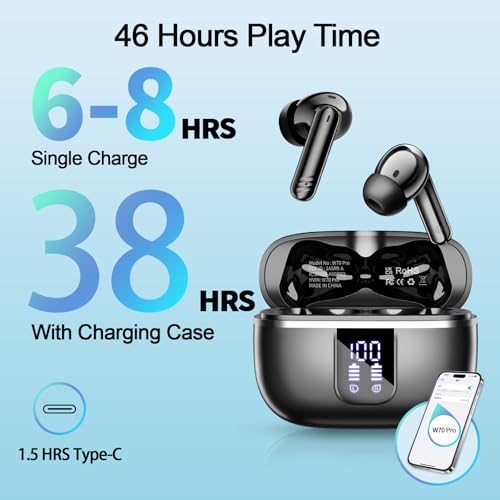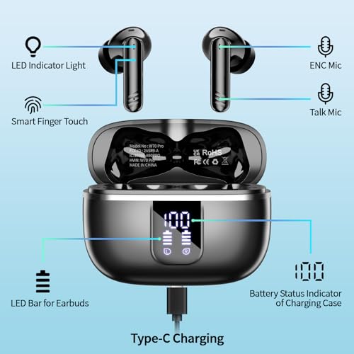 New Bluetooth 5.4 and More Stable Connection: The new W70 Pro Bluetooth 5.4 wireless earbuds has an overall performance improvement of 90% over the previous generation, providing smooth audio data transmission speed, more stable transmission experience and lower power consumption. This Bluetooth ear buds is compatible with all types of mobile phones and computers, and can be connected by opening the charging box.
