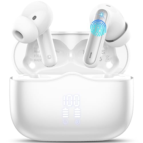 Wireless Earbuds, Bluetooth 5.4 Headphones in Ear 3D Bass Stereo, 40H Wireless Earphones with 4 ENC Noise Cancelling Mic, IP7 Waterproof Bluetooth Earbuds LED USB-C, Hands-Free Calls with AI, White